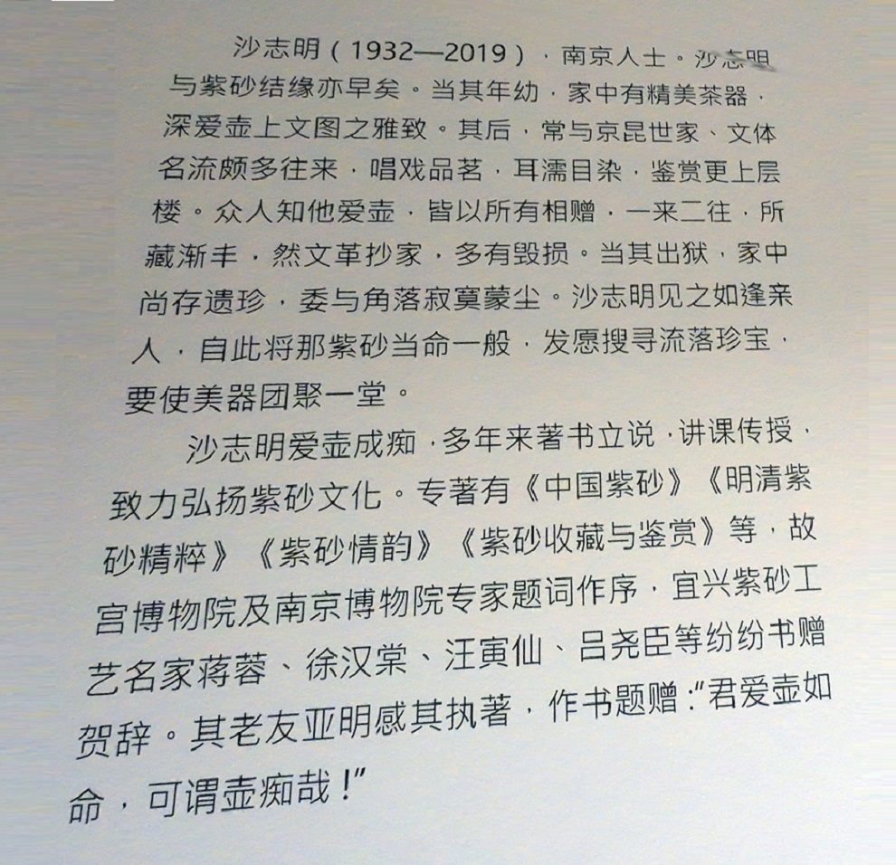 紫砂鉴藏家沙志明,别号壶痴。1932年7月,出生于江苏南京七家湾。少时与京昆世家子弟甘律之友善,习唱京剧,获名家好评。五十年代即有收藏紫砂。收藏老紫砂器一千余件,其中明清名家名作三百件。
