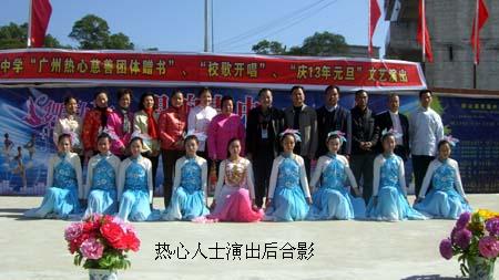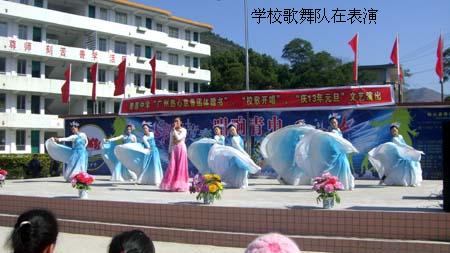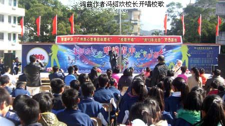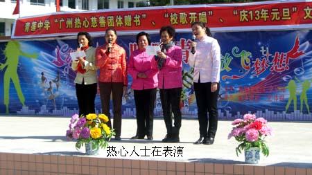 12月31日上午,秋高气爽,艳阳高照。青莲中学操场上人声鼎沸,热闹非凡。青莲中学隆重举行“广州热心慈善团体赠书”、“校歌开唱仪式”、“庆2013年元旦”文艺演出。演出首先由小组唱《最好的未来》拉开活动序幕,节目里还举行了“广州热心慈善团体赠书”仪式,广州热心慈善团体在领队钟伟莲老师的带领下,向我校500多学生每人捐赠了《现代汉语辞典》和《弟子规》,价值5万多元,还现场选出了一批学生形象标兵并进行表彰奖励。接着由词曲作者冯绍欢校长开唱了《青莲中学校歌》,冯绍欢校长优美的歌声,深深打动了在场的嘉宾和师生,全场师生情不自禁地唱起校歌来。广州热心慈善团体还表演了精彩的节目,与青莲中学师生联欢,把活动推向了新高潮。最后,学校舞蹈队表演了较大阵型的歌舞《祝福祖国》,让活动在一片欢乐的歌海里降下了帷幕。?