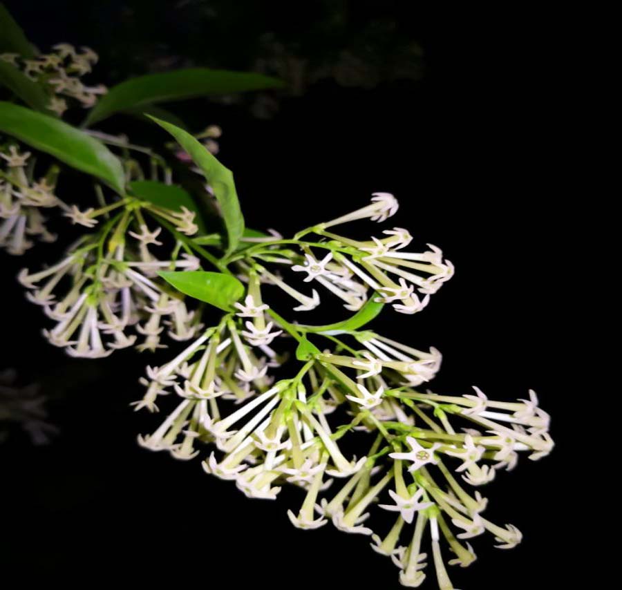 夜来香艳枝垂下,花色绿青至粉绿。傍晚开花扑鼻香,名符其实好名录。