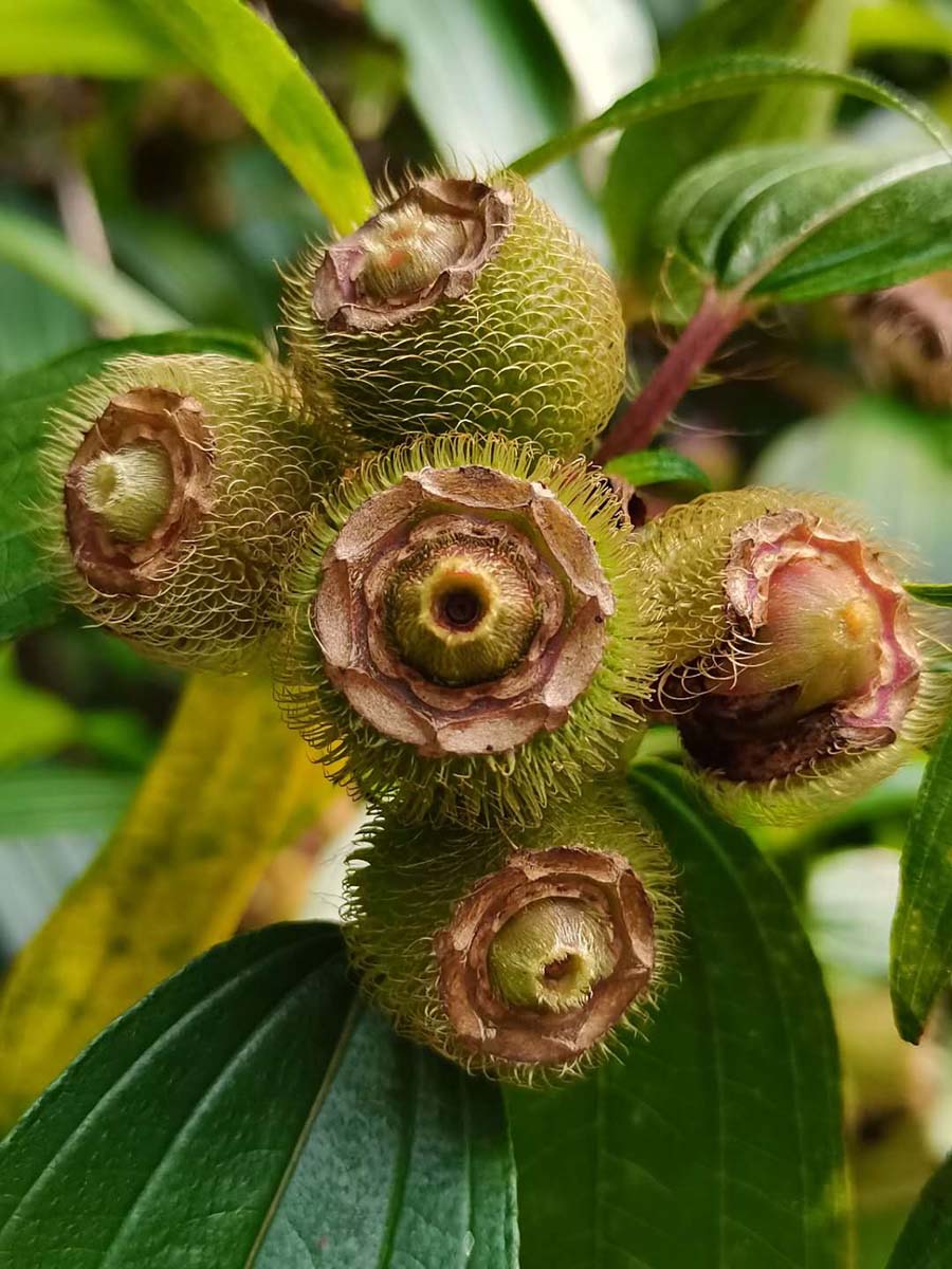 我国西南产野丹,花丝独特色鲜妍。四时常绿适应强,果实神奇似酒杯。