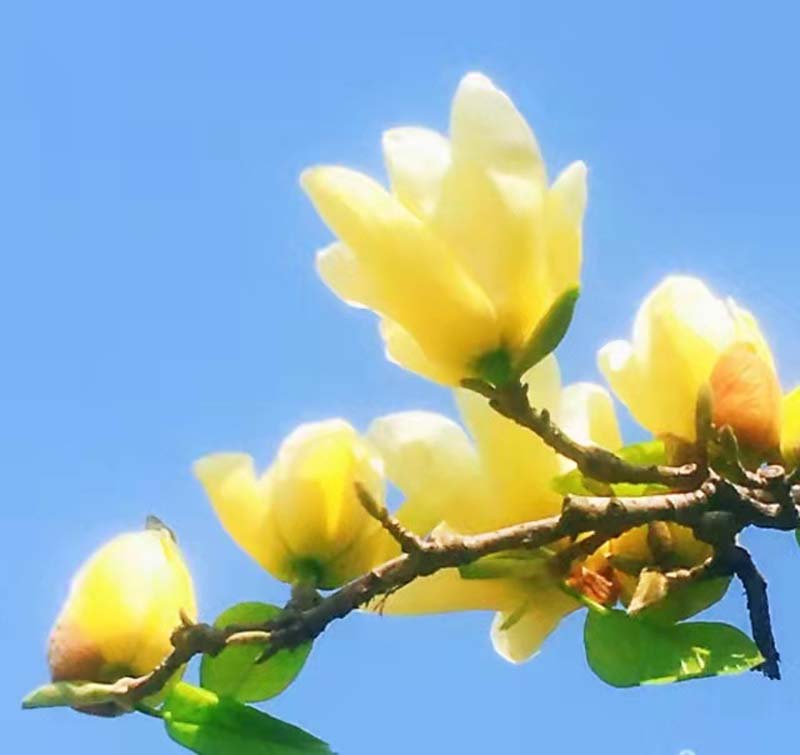 自古玉兰穿白裳,人工嫁接变金黄。原头来自苏湘赣,观赏价增高一樑。