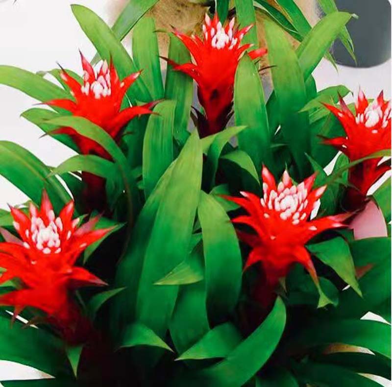 星花凤梨南美产,株型秀美叶光丽。花丛奇特花颜鲜,家中盆栽增气势。