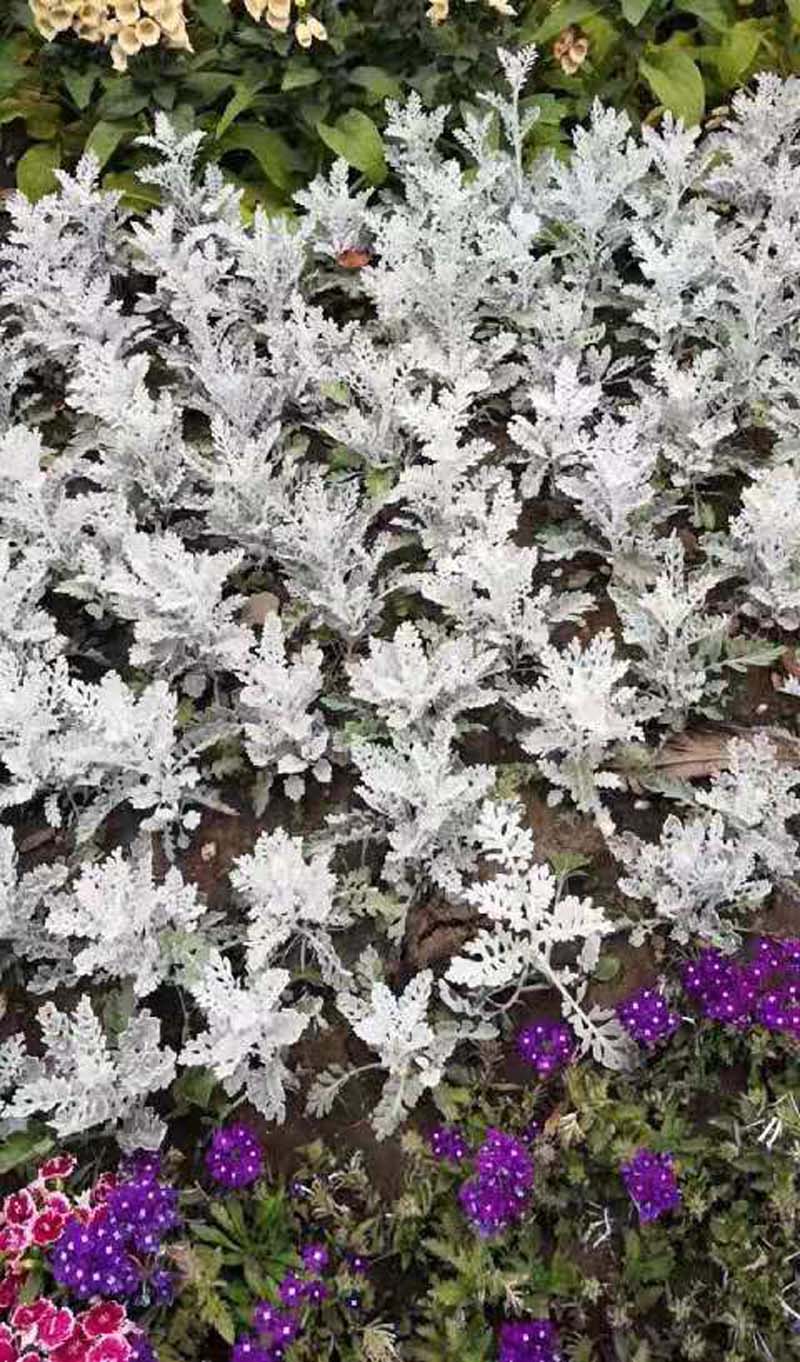 草本花枝银叶菊,来今巴囯地中海。叶中两面白毛被,好像雪花美丽彩。