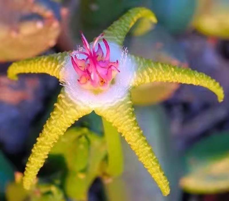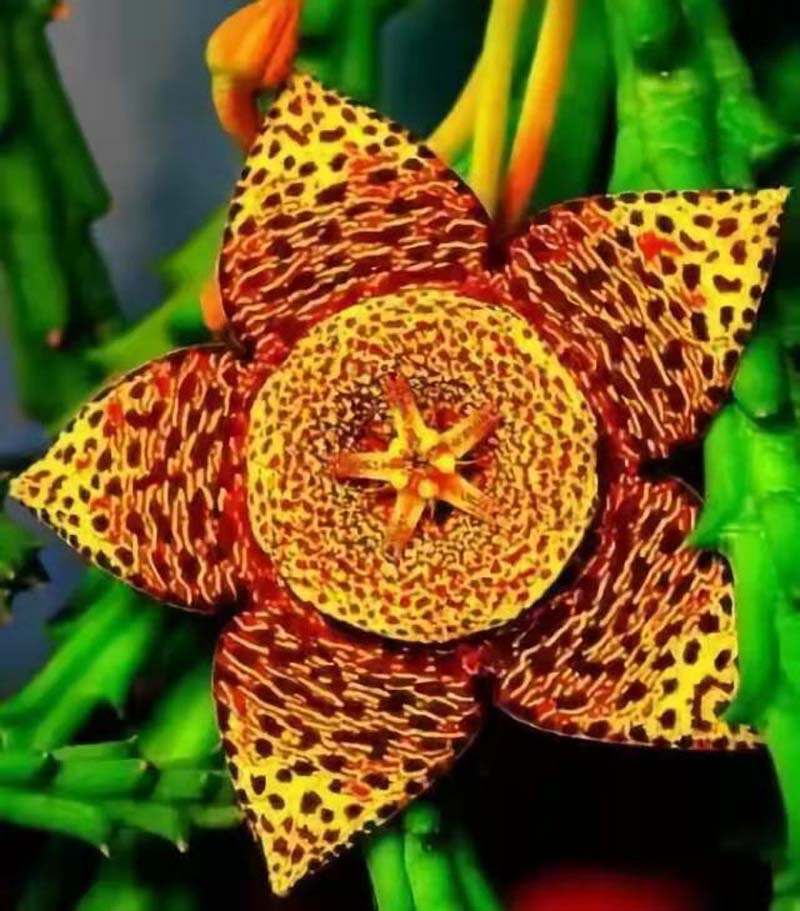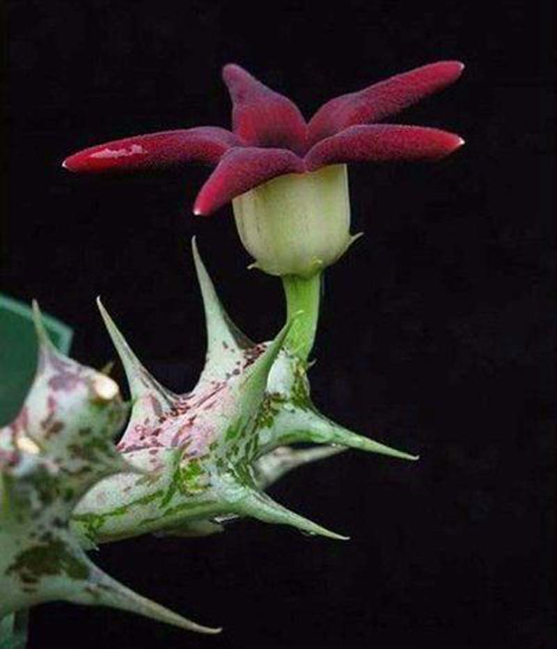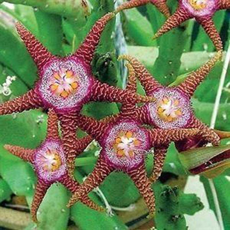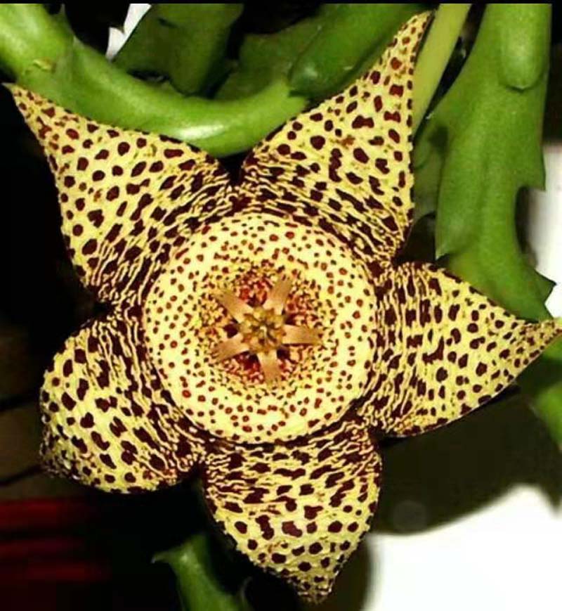 大花犀角植株矮,花大艳丽型怪特。状如海星扒地头,原来出自非洲国。