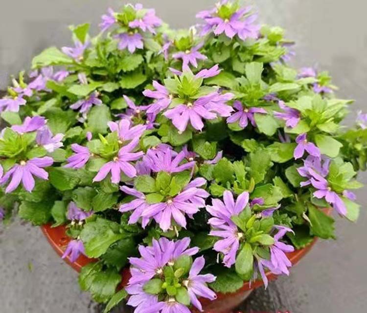 多年草本蓝扇花,柔软枝条四散爬。花簇奇稀似折扇,颜容美丽众人誇。