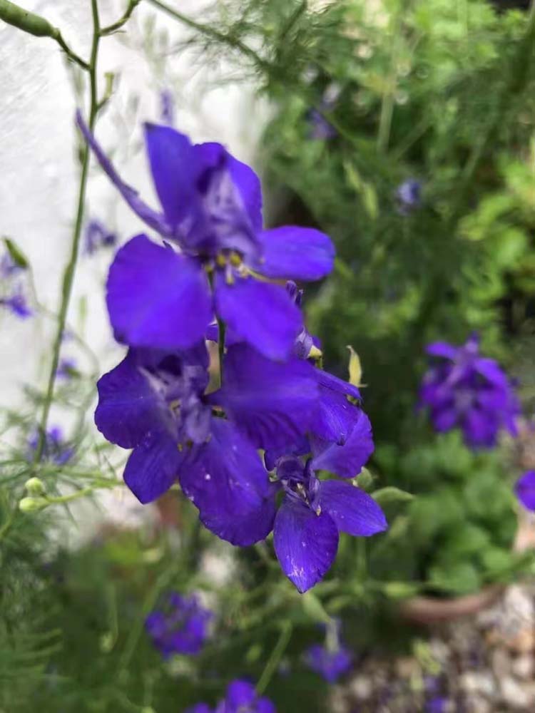 南欧翠雀产南欧,花朵酷如燕子飞。形态优雅惹人爱,色斑淡淡众家誇。