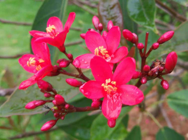 珊瑚花草迷人木,叶如提琴产美洲。形似樱花常艳丽,观花观叶又观头。