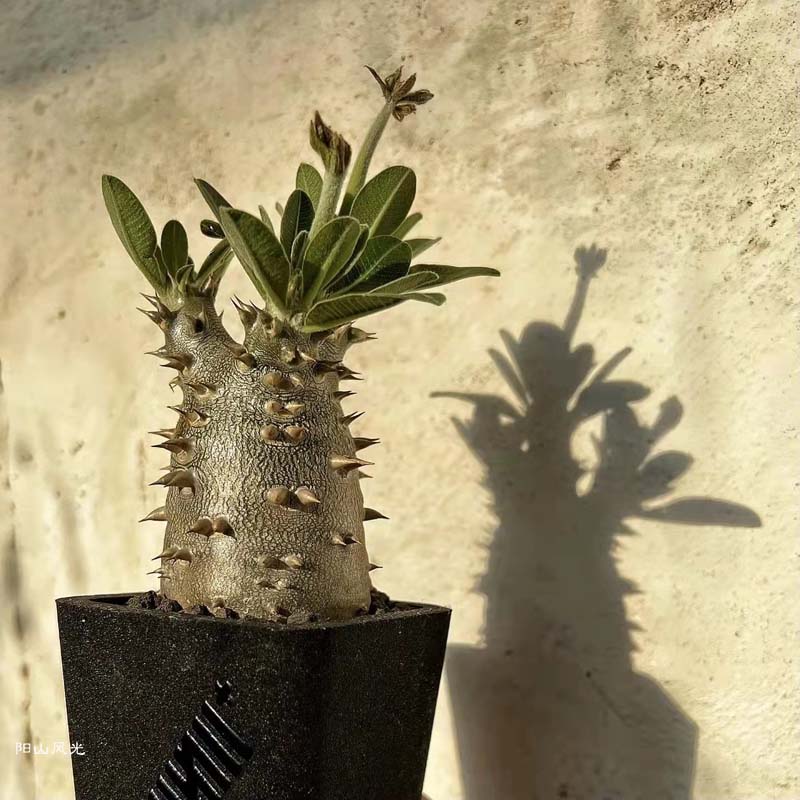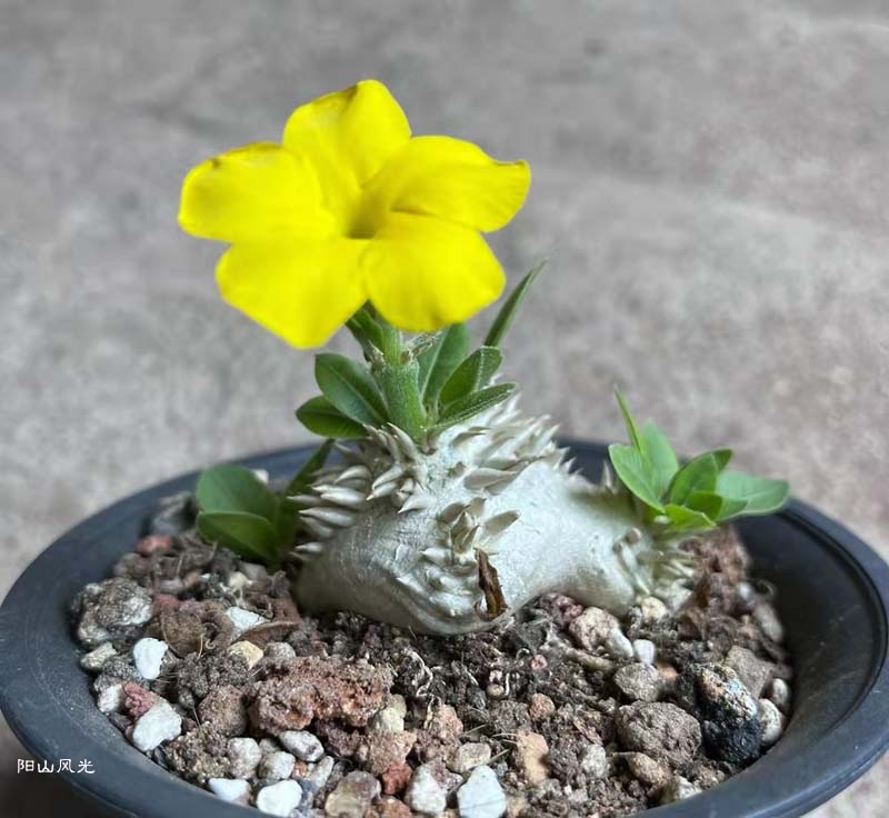 短棒棒槌树,肉身殊状茎。花从叶丛出,鲜亮柠檬黄。