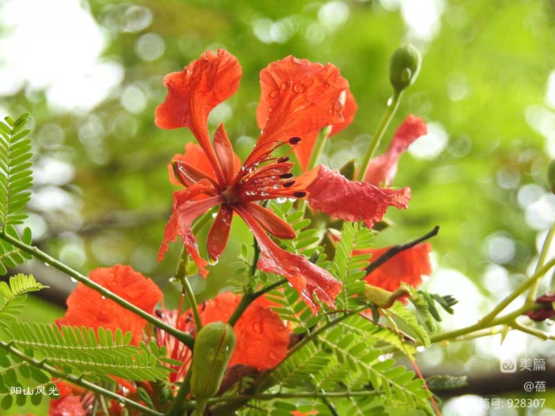 绚丽多奇金凤花,茎青木质叶光华。花如鹤顶似鹰凤,姿态优容媚悦霞。