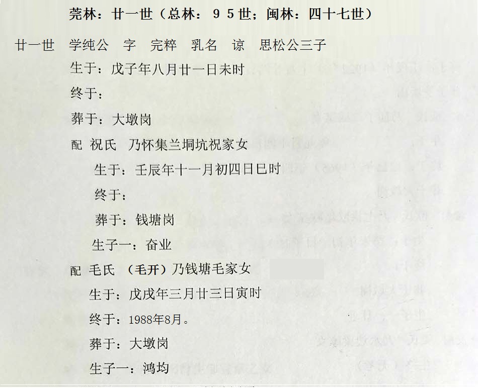 林学纯:字 完粹,乳名 谅,思松三子,生于戊子年八月二十一日未时。葬于大墩岗。