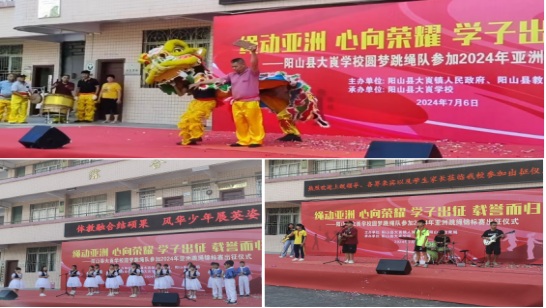 大崀镇举行圆梦跳绳队参加2024年亚洲跳绳锦标赛出征仪式.。   出征仪式中,回顾了学校跳绳队的发展历程,对教练袁治安的辛勤付出和马城凤、李雪琴、马心茹、曾小玲等4名出征队员的刻苦训练表示衷心感谢。希望同学们要保持良好的心态,发扬团结协作、顽强拼搏的精神,赛出风格,赛出水平。