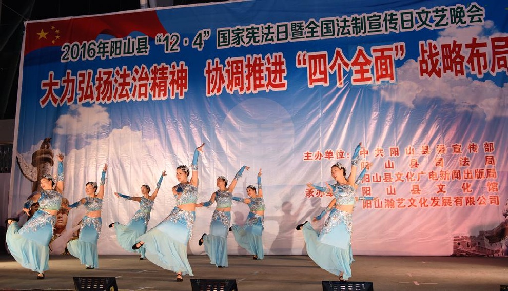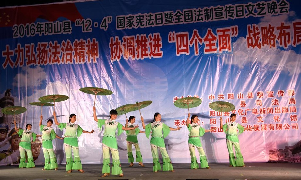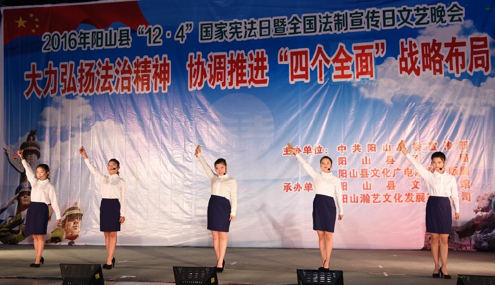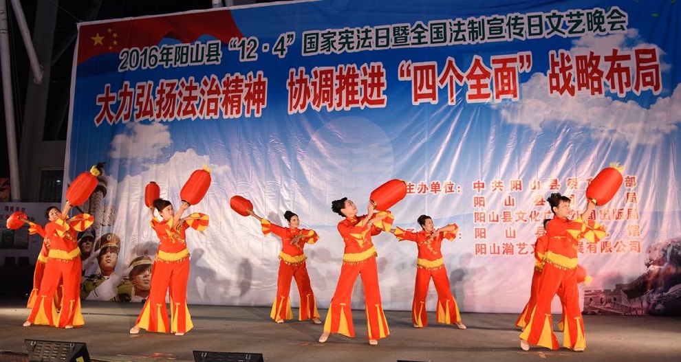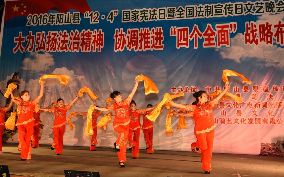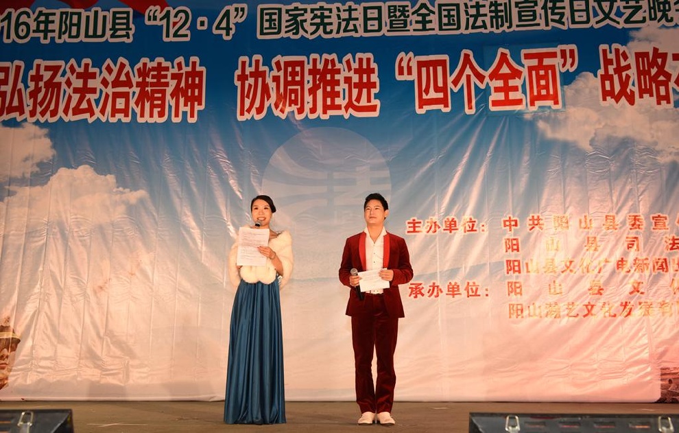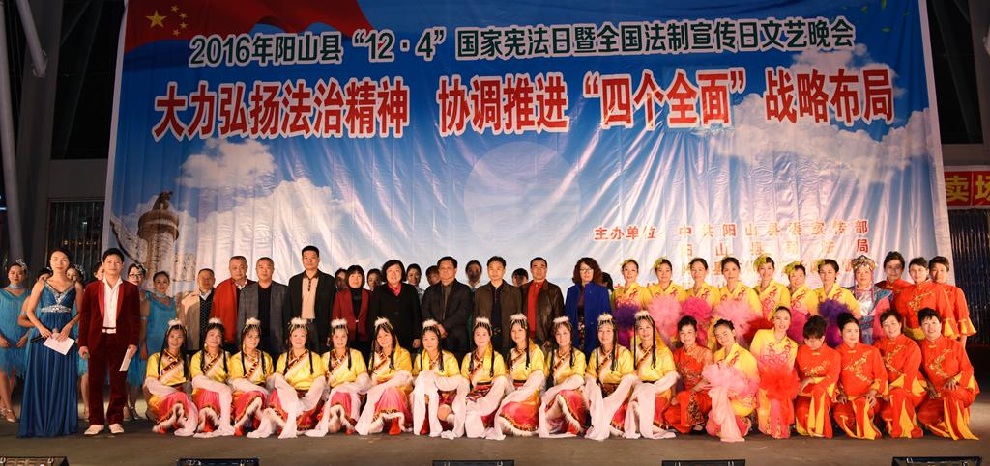 12月1日晚7:30,由中共阳山县委宣传部、阳山县司法局、阳山县文化广电新闻出版局主办,阳山县文化馆和阳山县瀚艺文化发展有限公司承办的“2016年阳山县12.4国家宪法日暨全国法制宣传日”文艺晚会在阳山影剧院门前广场隆重举行。前往观看晚会的领导有中共阳山县委常委、政法委书记朱燕群,中共阳山县委常委、宣传部部长李素娟,阳山县人民政府副县长、公安局局长黄构恩,阳山县人大副主任李神娣,阳山县政协副主席熊雄,阳山县委宣传部副部长唐志荣,阳山县司法局局长甘志科,阳山县司法局副局长欧阳广华,阳山县普法办主任李永和,阳山县文化广电新闻出版局副局长高桂梅。