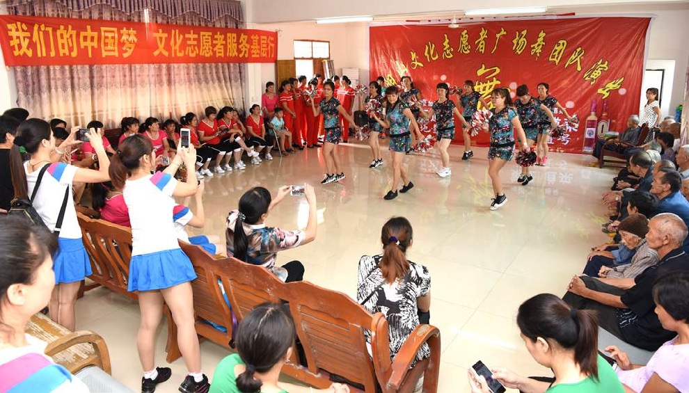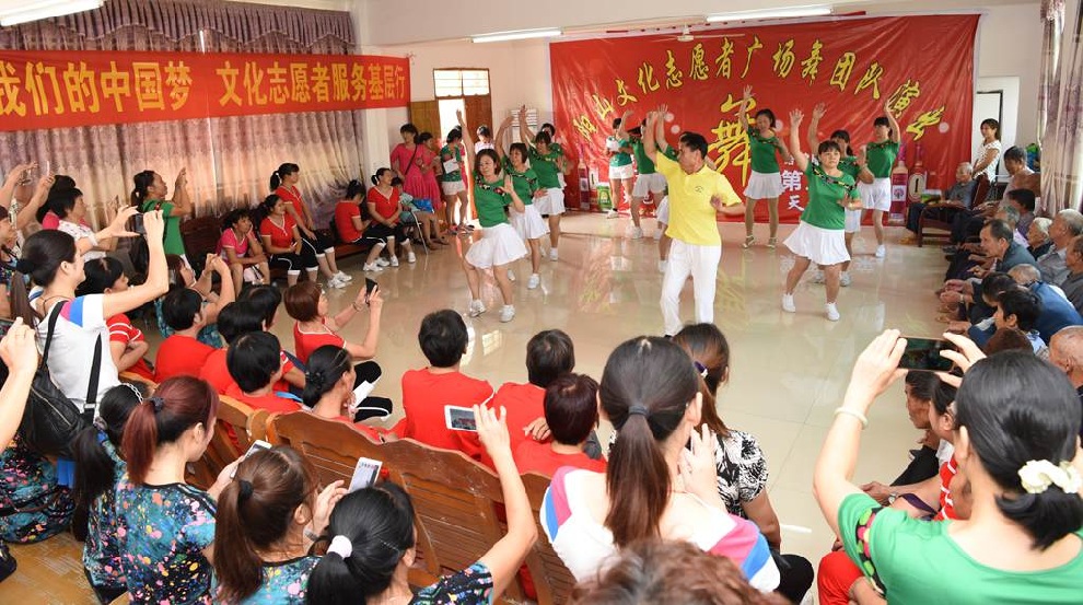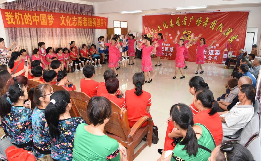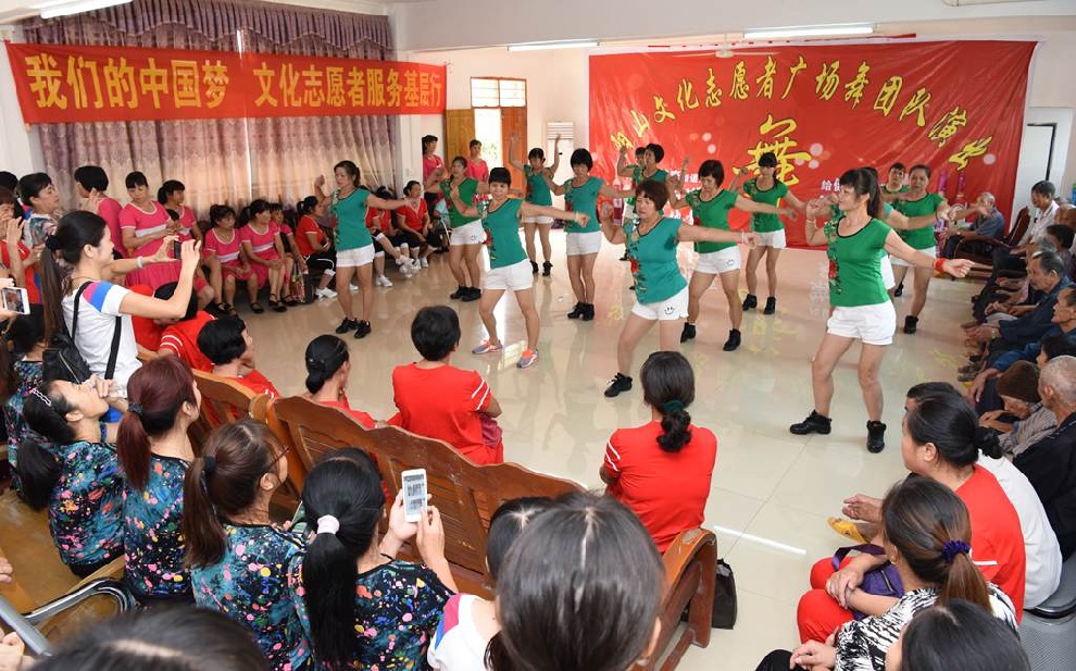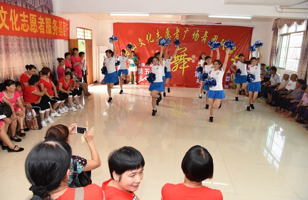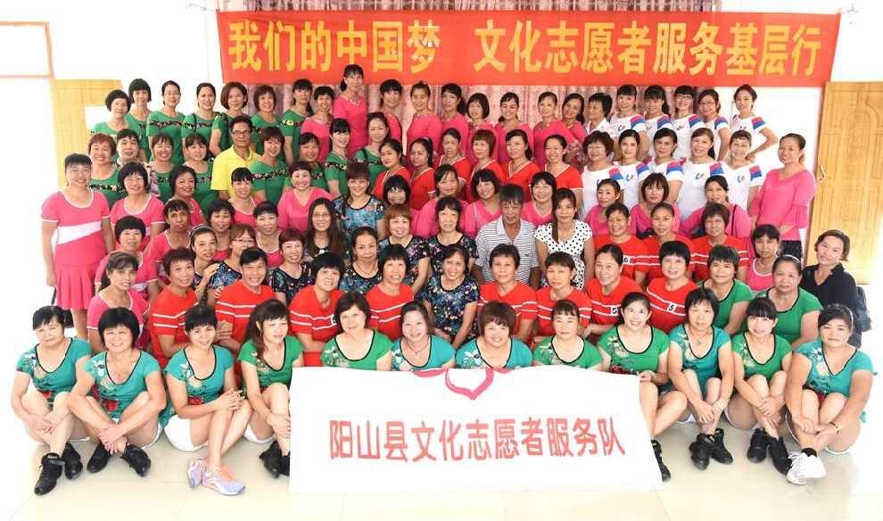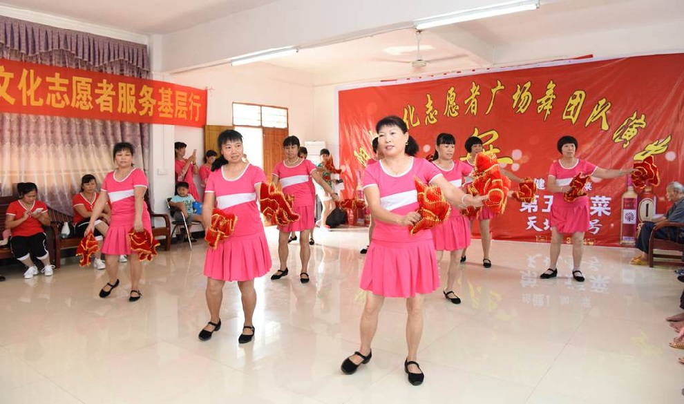 阳山县文化馆于2016年9月24日上午组织文化志愿者(开心丽人队、阳明健身队、晨曦健身队、影院队、健康队、小江曲艺舞团队、七拱缘聚队、杜步开心队、阳城镇春风舞蹈队)到七拱镇新圩敬老院慰问演出。我县文化志愿者所到之处,得到了当地敬老院和老人们的热烈欢迎,文化志愿者不仅为老人们送上欢快、喜庆的优美舞蹈,还自筹资金为老人们送上礼物及“红包”,与老人们一起欢度开心欢乐的一天。