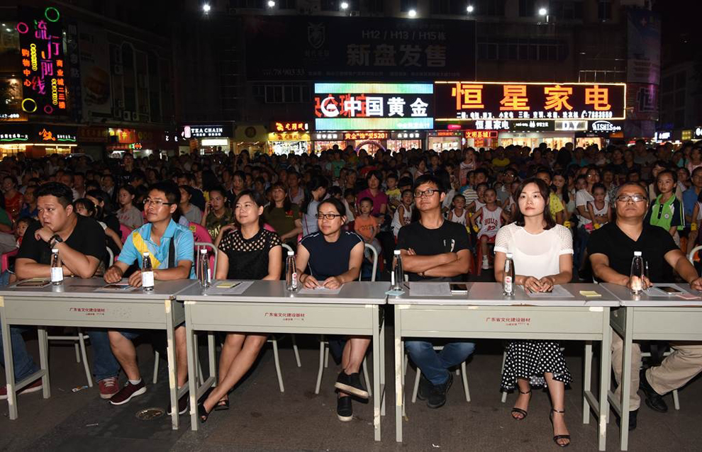 评委们(右起:邓荣煌、张海苑、唐伟坚、欧阳毅贞、杨映红、邓远通、李健伟)正认真观看参赛选手的演出。。