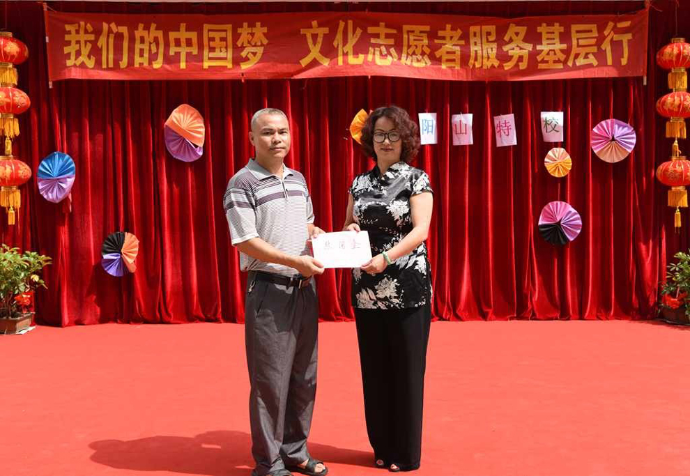 文广新局党组成员高桂梅与文化志愿者一起为“特校”学生发放礼品。