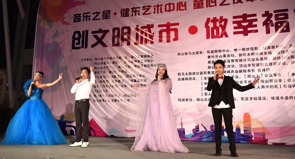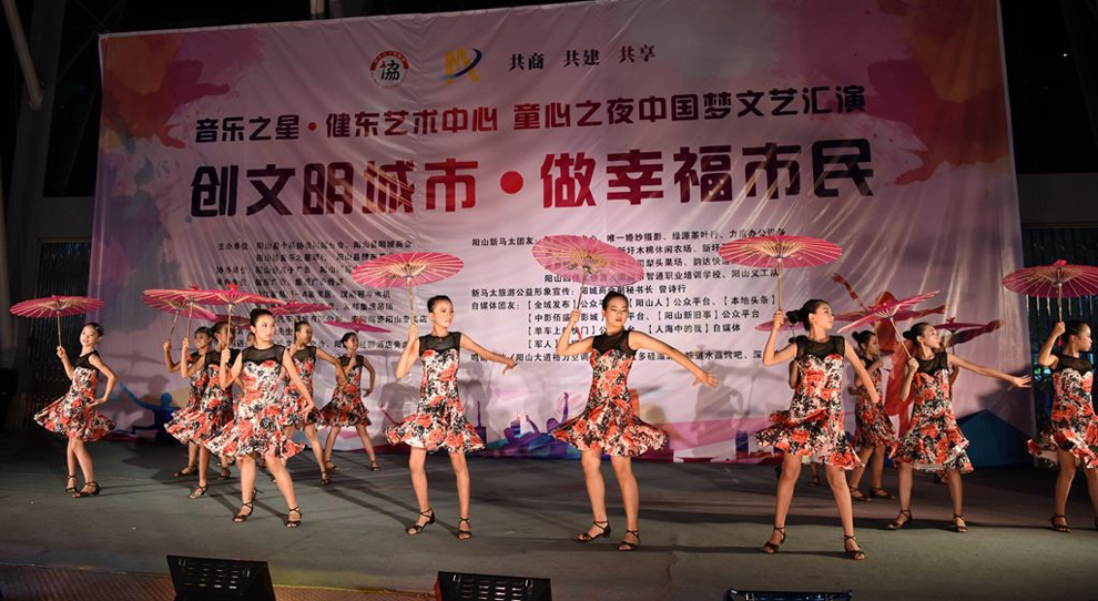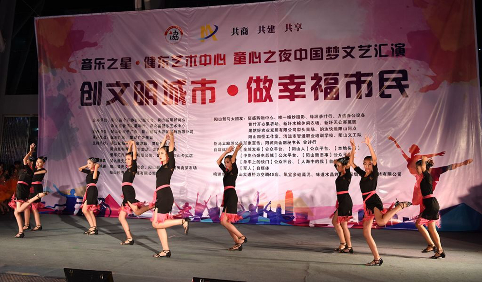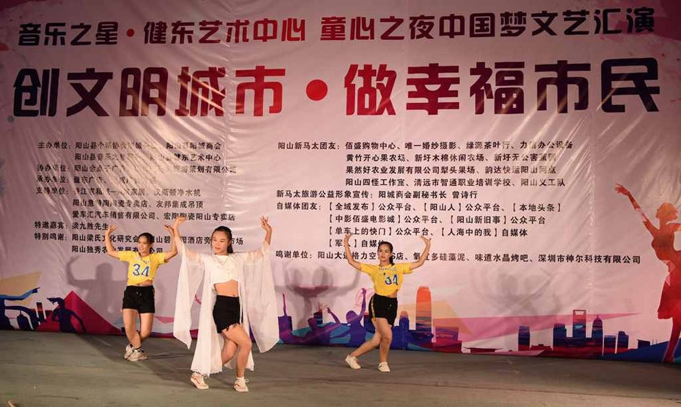 由阳山县个私协会阳城分会、阳山县阳城商会、阳山县音乐之星琴行、阳山县健东艺术中心联合主办的,“创文明城市.做幸福市民”——音乐之星.健东艺术中心.童心之夜中国梦文艺汇演,于2017年7月31日晚在阳山影剧院门前广场举行。