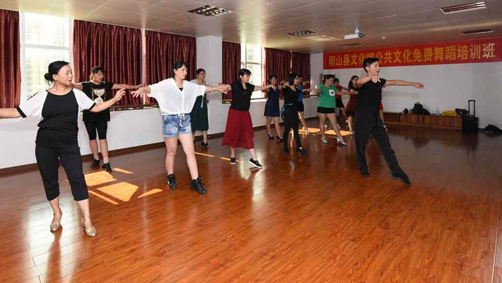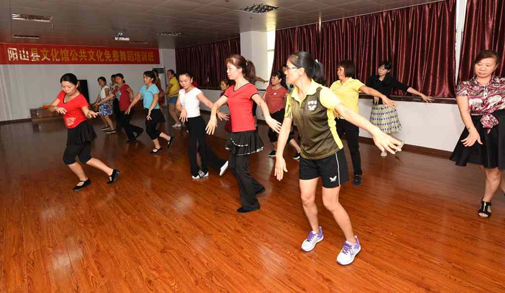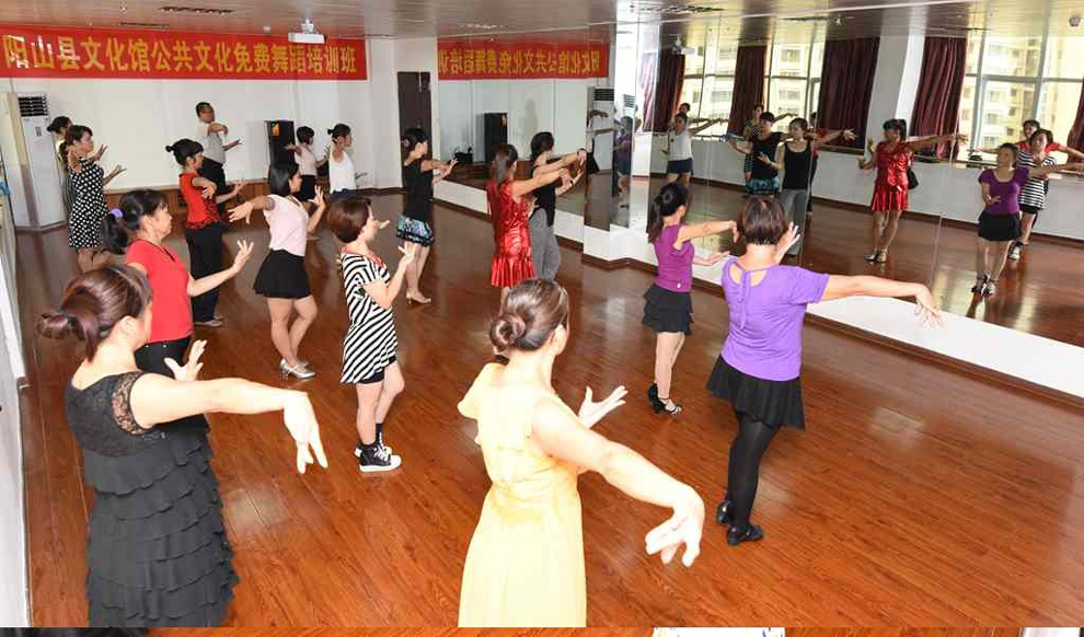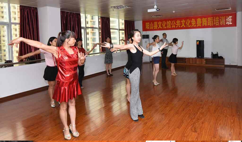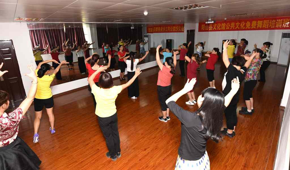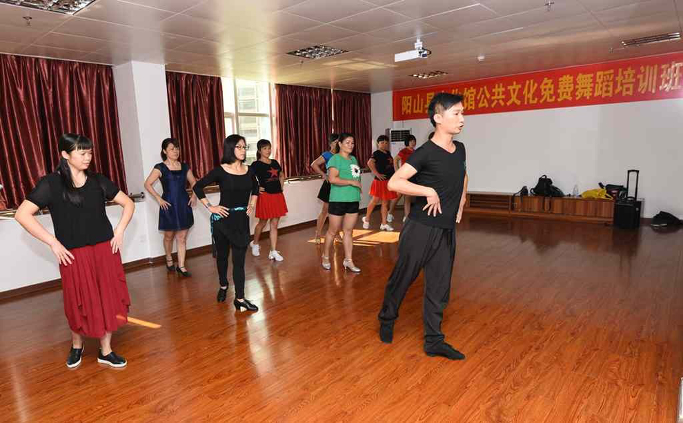 为繁荣和丰富群众的文化生活,提高广大群众的文化幸福感,县文化馆于2017年9月16日至9月30日(逢星期六、日共5天)举办2017年第一期舞蹈公益培训班,本期开设4个班,其中拉丁舞2个班、民族舞2个班,每班招收学员20人,共培训学员80人。培训地点:阳山县文化馆舞蹈室。