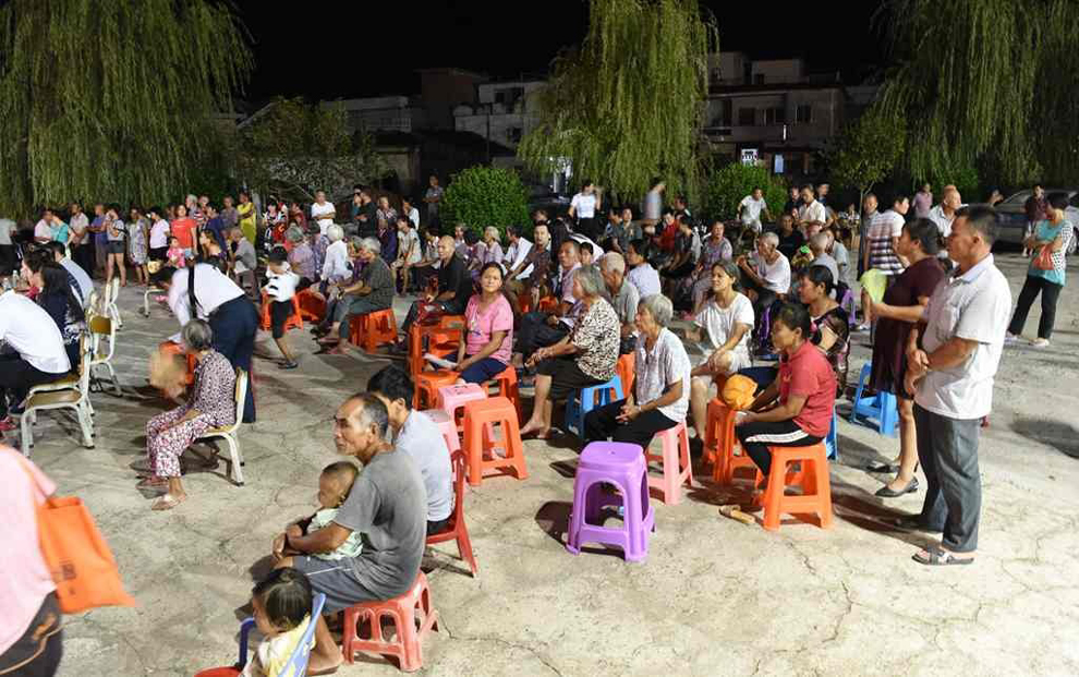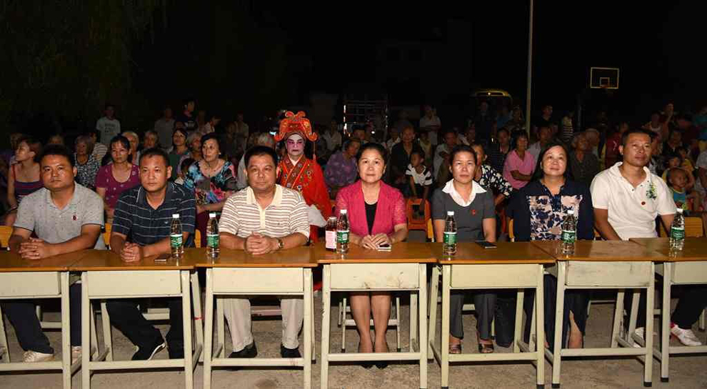 县政协副主席熊雄(左3)、县政协副主席祝翠冰(左4),岭背镇镇长邓俊伟(左2)、镇党纪委书记古志芬(右3)、镇党委委员邓伟明(右1)、副镇长简泽星(左1)在一起观看演出。