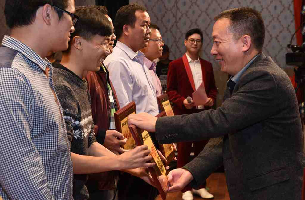 县委常委梁伦平为获优秀组织奖的乡镇代表颁奖。