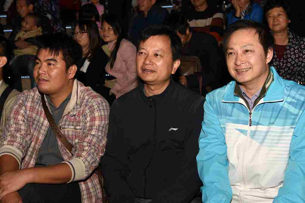 县文广新局副局长李万亮(中)、文化馆馆长梁慧标(左)、原文化馆馆长丘成业(右)在一起观看演出。