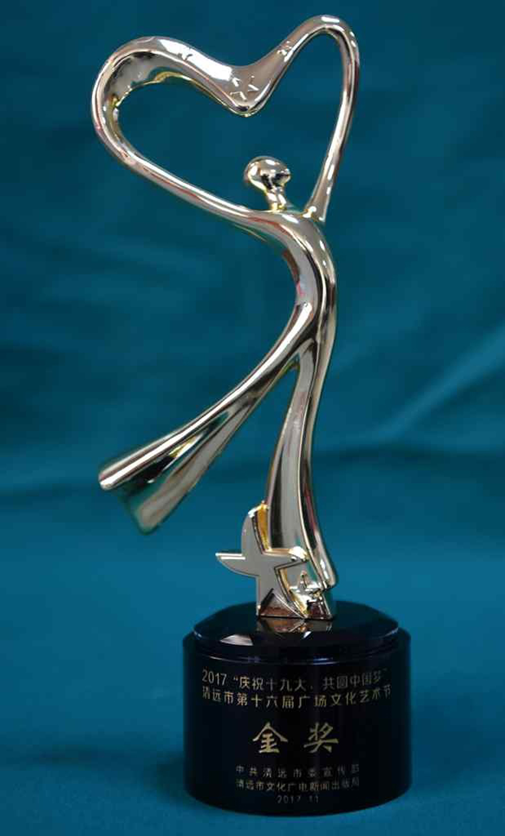 舞蹈《瑶乡恋》、歌舞《祖国万岁》、女声独唱《瑶山情歌》、粤曲独唱《中秋寄情》、小品《超幸福鞋垫》获银奖的奖杯。