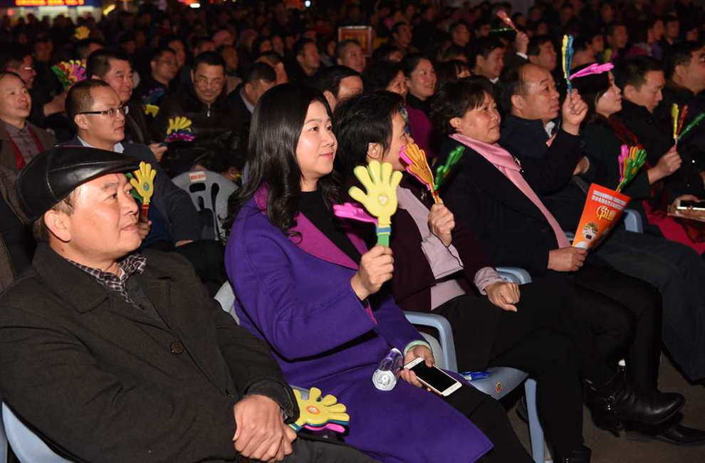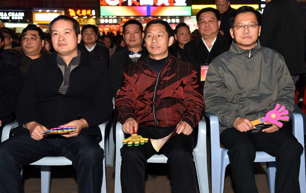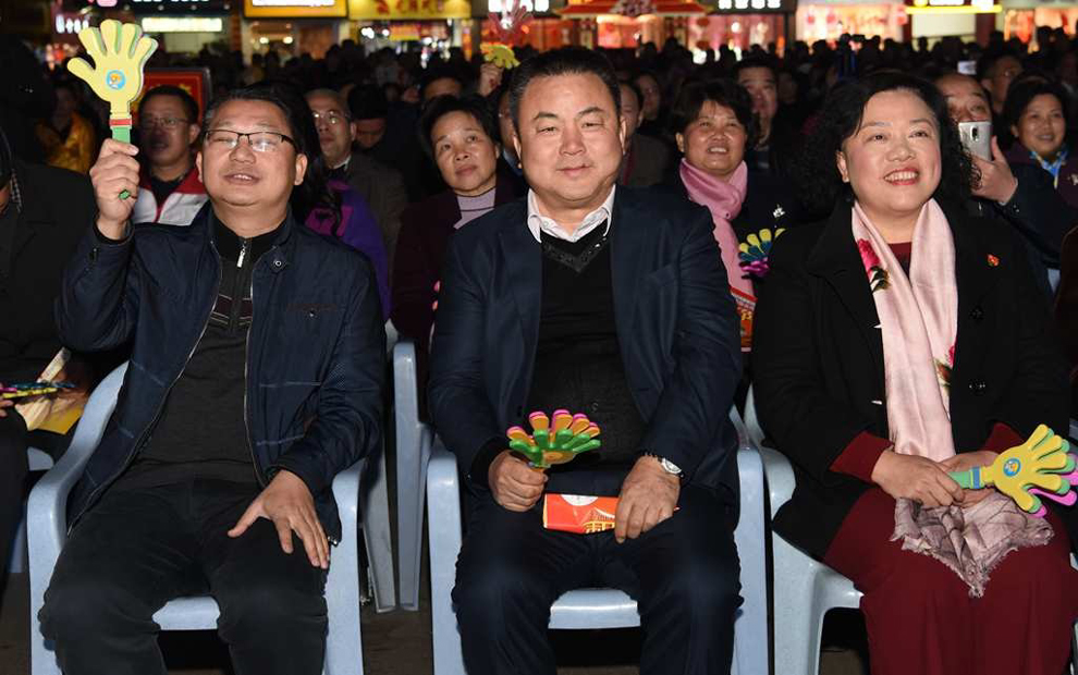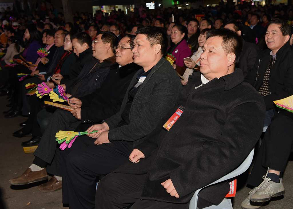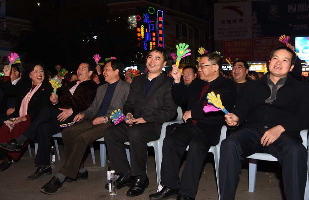 县领导李素娟、梁伦平、王健、陈永坤、黄构恩、熊雄等在一起观看演出。