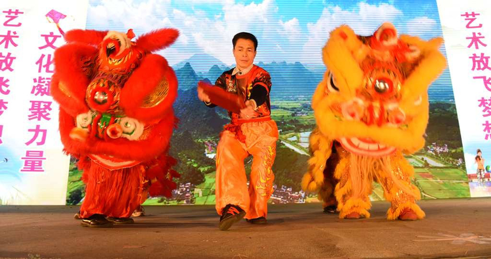 由七拱镇醒狮队表演的暖场节目民间艺术表演《雄狮舞动》。