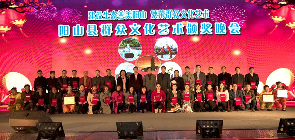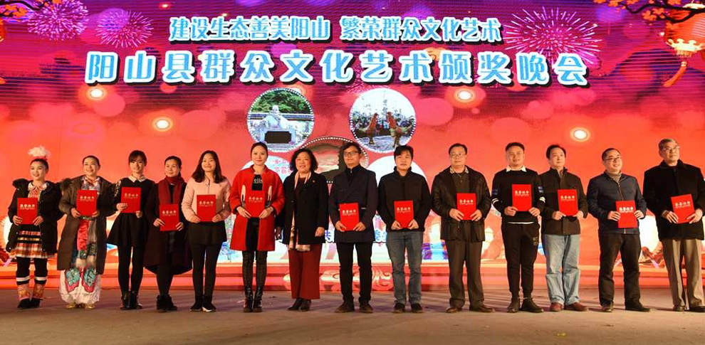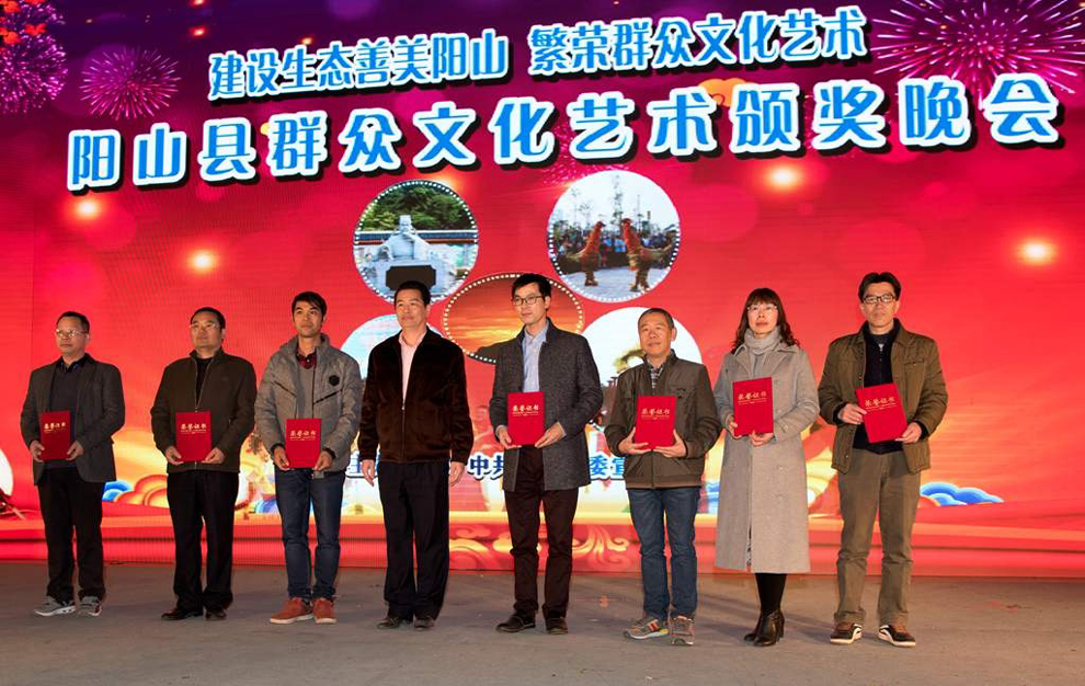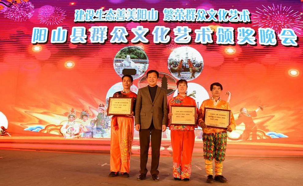县委书记余国平为获得民间艺术团队奖项的代表颁奖并合影。