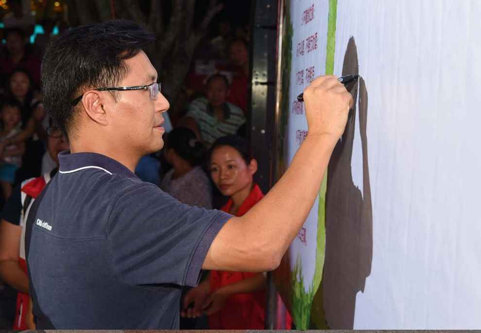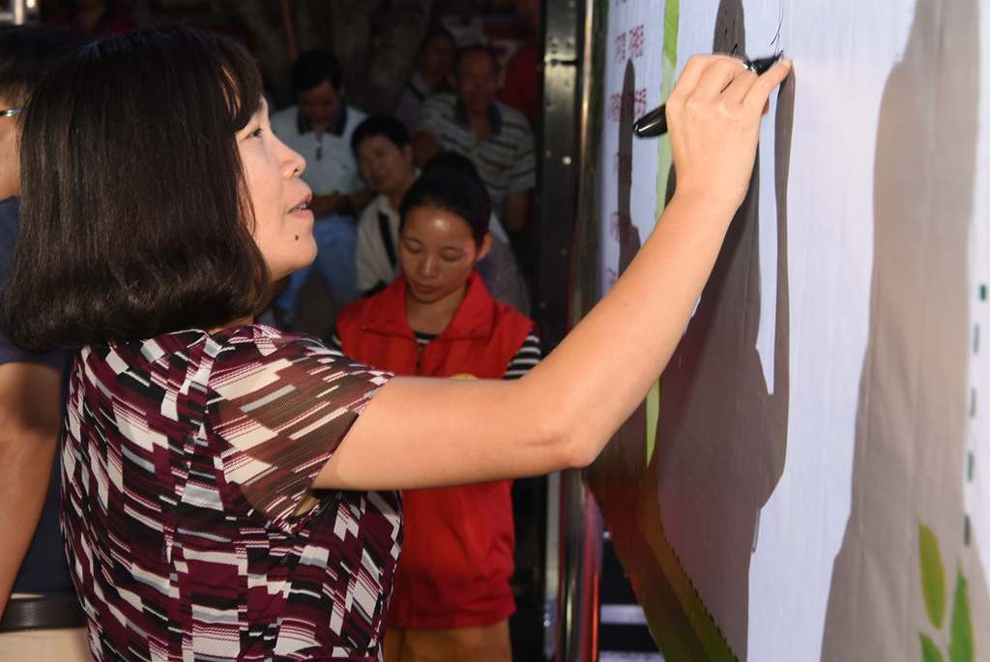 县委常委、宣传部长李素娟在阳山县“守法、知礼、亲善”行为准则宣传幕签名。