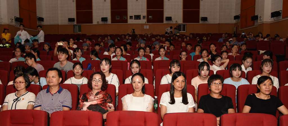 县文化广电新闻出版局副局长李万亮(左2)、县团委副书记黄洁菲(左1)与评委们【县委宣传部高桂梅(左3)、县文化馆副馆长谭佐琴(右2)、县团委卢美荷(右1)、县碧桂园小学教师梁婵娟(右4)、县实验小学教师高春霞(右3)】在一起观看演出。