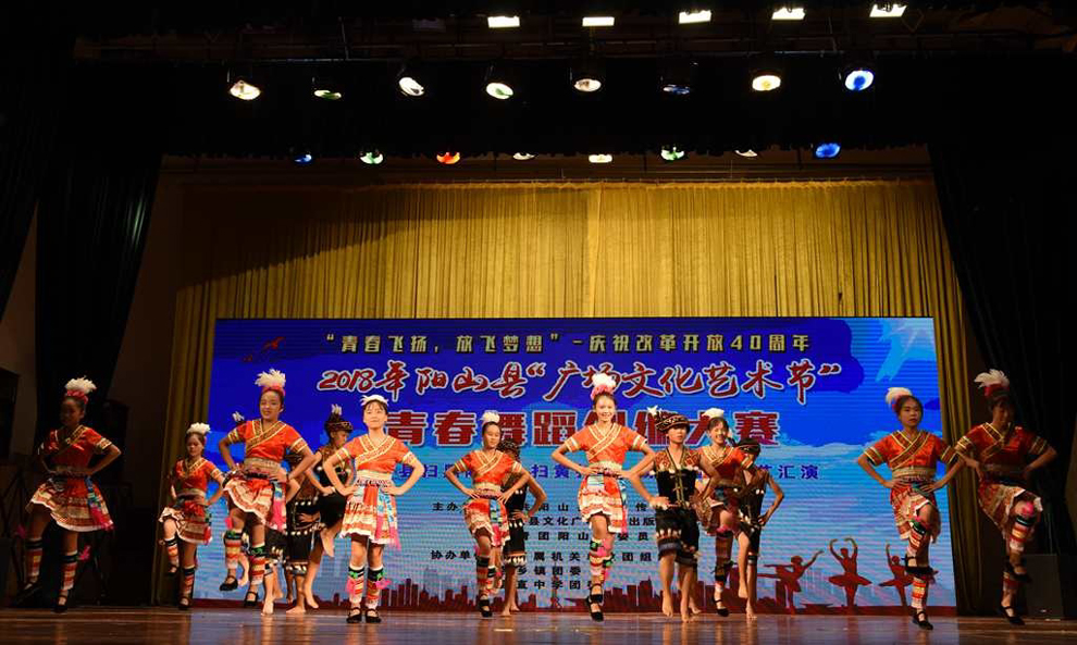 2018年9月19日,由中共阳山县委宣传部、阳山县文化广电新闻出版局、共青团阳山县委员会共同主办“青春飞扬?放飞梦想”——庆祝改革开放40周年,2018年阳山县“广场文化艺术节”暨阳山县扫黑除恶、扫黄打非、禁毒宣传文艺汇演,在县影剧院隆重开幕。