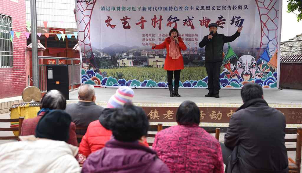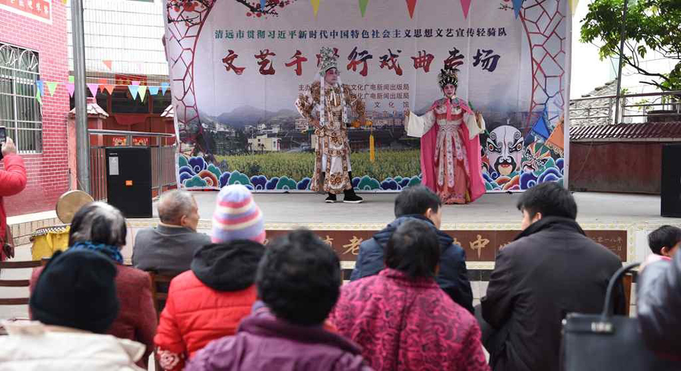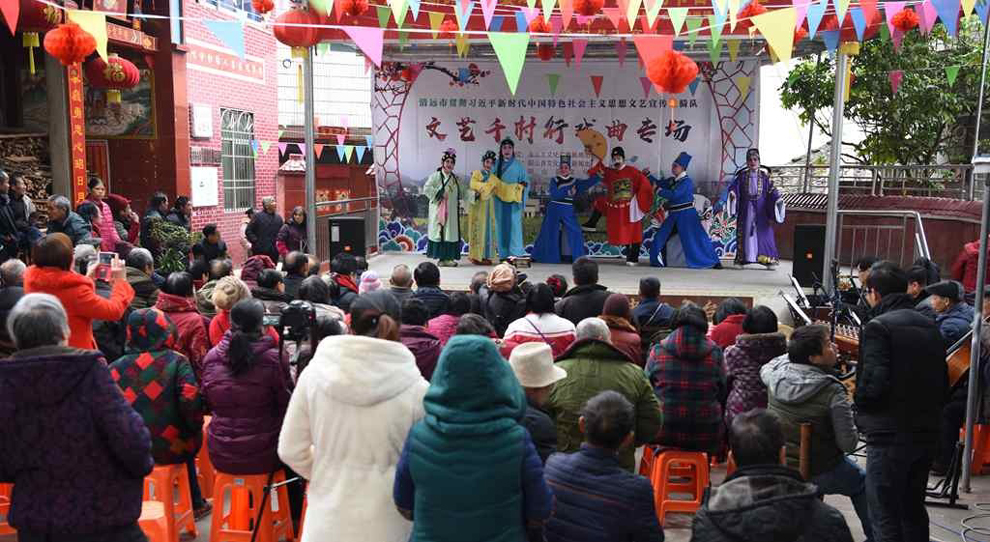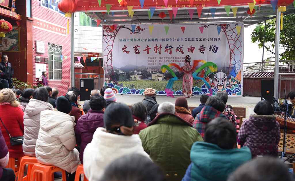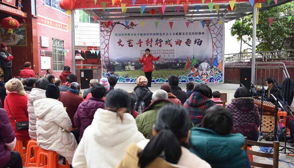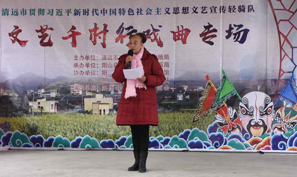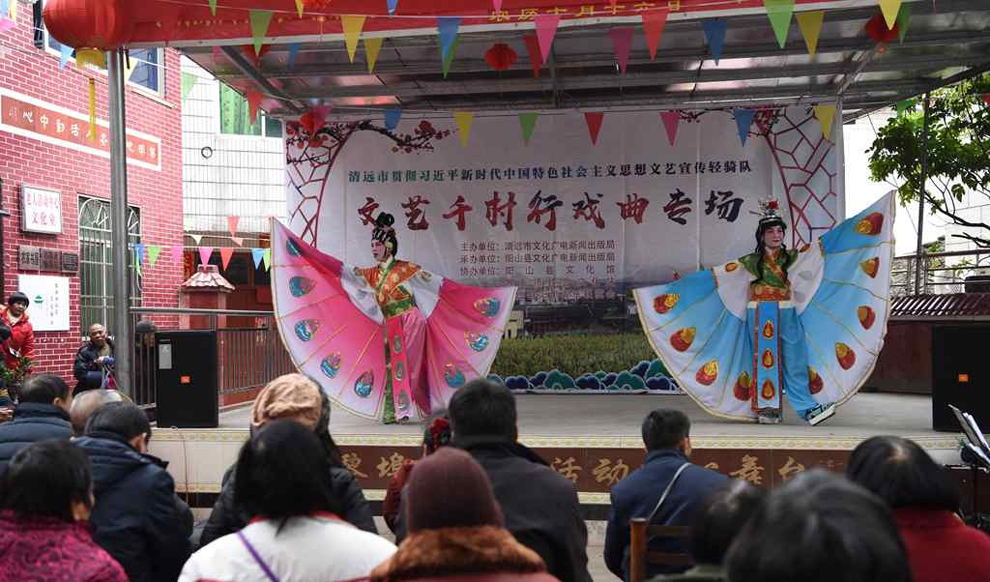 为宣传贯彻党的十九大会议精神,普及和传承中华优秀传统文化,繁荣农村戏曲市场,根据清远市文化广电新闻出版局《关于做好宣传习近平新时代中国特色社会主义思想文艺轻骑队暨清远市民生十件实事—戏曲进农村演出相关工作的通知》(清文通【2018】59号)精神,紧紧围绕县委、县政府实施乡村振兴战略“三个全域两大攻坚”系列行动,阳山县文化馆组织阳山县阳禺粤乐联谊会送戏下乡深入本县农村基层开展“贯彻习近平新时代中国特色社会主义思想文艺轻骑队—文艺千村行戏曲专场”演出活动,用曲艺的清歌雅韵把欢乐带给现场的父老乡亲们,受到当地群众的热烈欢迎。主办单位:清远市文化广电新闻出版局。承办单位:阳山县文化广电新闻出版局,阳山县文化馆,各乡镇综合文化站。演出单位:阳山县阳禺粤乐联谊会。演出时间:2018年12月29日上午,演出地点:阳山县黎埠镇黎埠居委会。