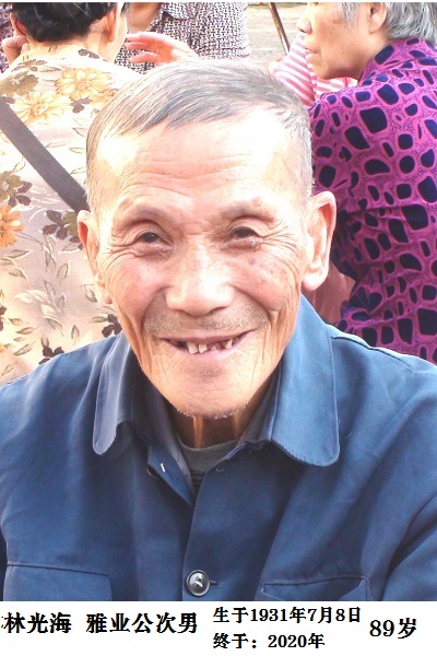 林光海 雅业公次男 生于1931年7月初八日辰时。共和国成立初曾和算业公出国到朝鲜打美国鬼。回国后务农。政府安排他们负责太平圩的环保清洁工作。直到退休。