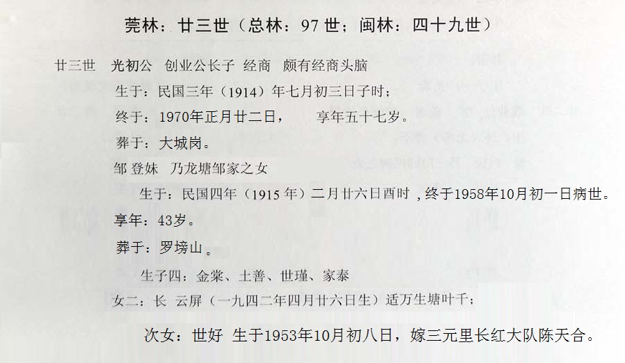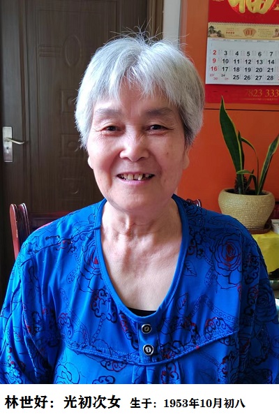 林世好 次女 生于:1953年10月初八日。嫁广州三元里长红大队陈天合(1948年5月初一日)为妻,生育一男一女。儿子陈建强生于1978年11月23日。女儿:陈建勤生于1984年5月初六日。