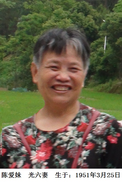 陈爱妹 妻子 潭村陈庆探之女,单位:连山卫生局。生于:1951年3月25日。