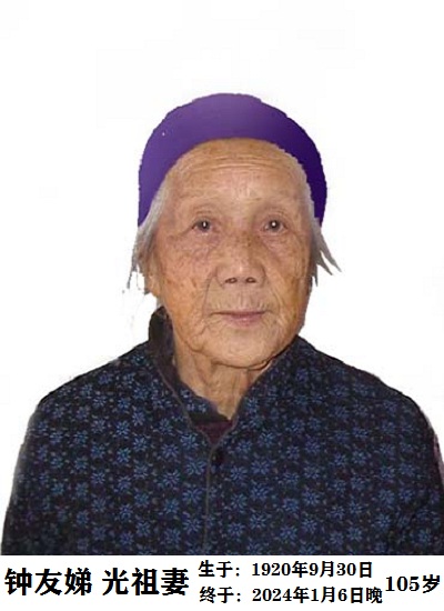 钟友娣 妻子 源谭村钟阿养之女,生于1920年9月30日;终于2024年1月6日晚上