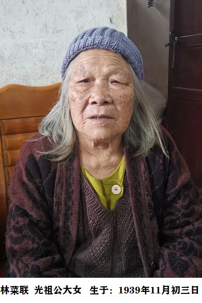 大女儿 生于:1939年11月初三日。嫁佛仔洞成诗来为妻,生育保意妹、保、冰等四子一女