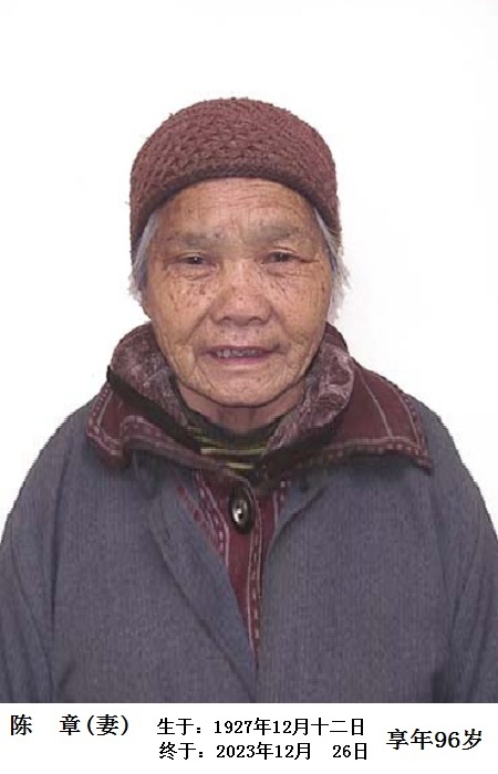 陈 章(妻) 生于:一九二七年十二月十二日酉时出生,