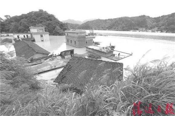 该镇江咀小学路段周边形成一处面积达6.5平方公里、容量3000万立方米的堰塞湖。平静的湖面,洪水淹没了电线杆,树木、渔网、杂草、电线等,水面和水下情况很复杂,放眼望去,湖的北面成片被淹的民房触目惊心。