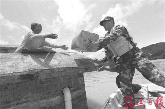 装上食品和水,坐上10个战士,为被洪水围困的群众送去了矿泉水、面包、饼干等食物和蜡烛、电筒等日常必需品;返回时转移受灾群众,一个来回要两个小时。