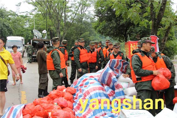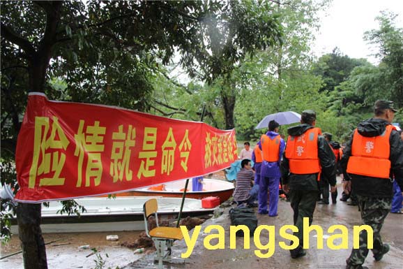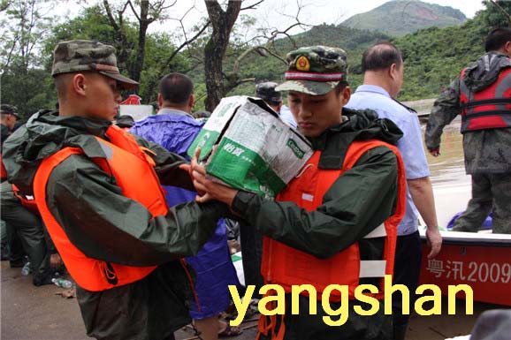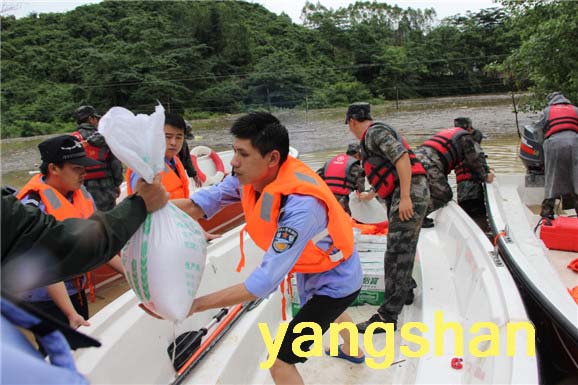 25日凌晨,从太平镇进入白莲片村庄的道路被打道,阳山县组织出动解放军、武警、消防、民兵、公安、水务、交通、通讯、教育、卫生等部门及受灾乡镇党员干部群众约300人,出动冲锋舟15艘,在洪水中来穿行30次,冒险将面包、矿泉水、方便面等挨个送到被困的村小组村民手中,同时将仍处于危险地带的村民转移,把病人运送救治,全力进行抢险救灾。
