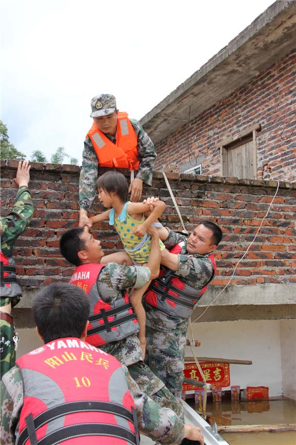 阳山县人武部职工李建平,在得知家中遭受洪水浸淹的情况下,仍毅然随队赶赴受灾点执行任务,与队友一道冒着生命危险在湍急的洪水中参与解救了19名被困群众。
