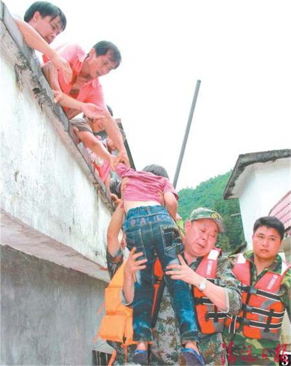 同镇的岩口村,破旧的泥砖房泡在水里摇摇欲坠,60多岁的张天有夫妇被困在房中。村民唐文峰向村委会报告险情,村支书唐国庆找来几根木头钉成一架木排,前往救人。唐文峰水性较好,先行潜入,先后把受困老人拉到木排上,唐国庆则在水里控制木排。木排刚离开5米,房屋轰然倒塌。