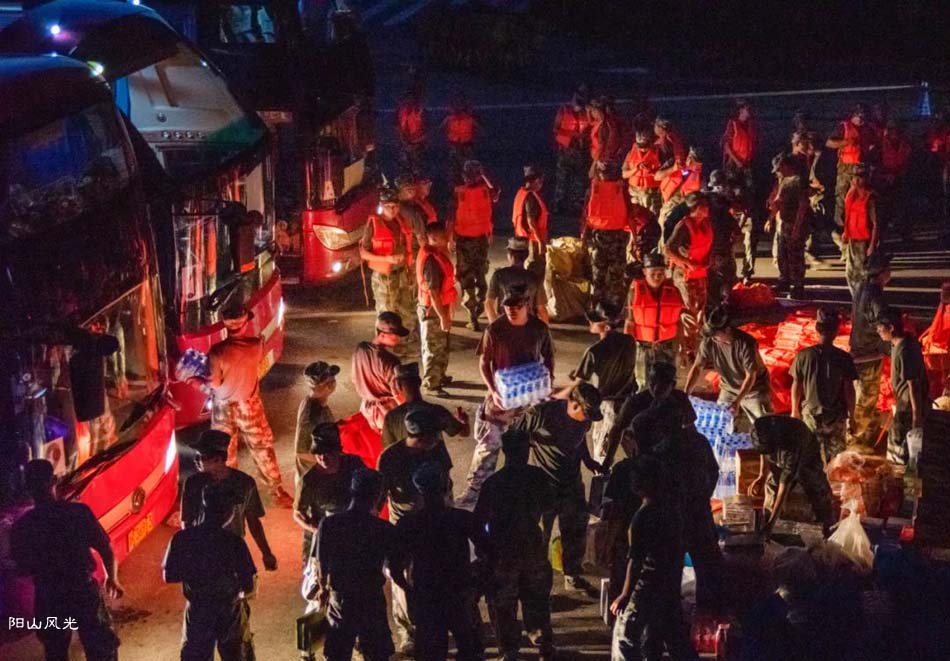 ▲2022年6月22日晚,部队官兵在英德市江湾桥搬运物资。摄影|袁浩稀