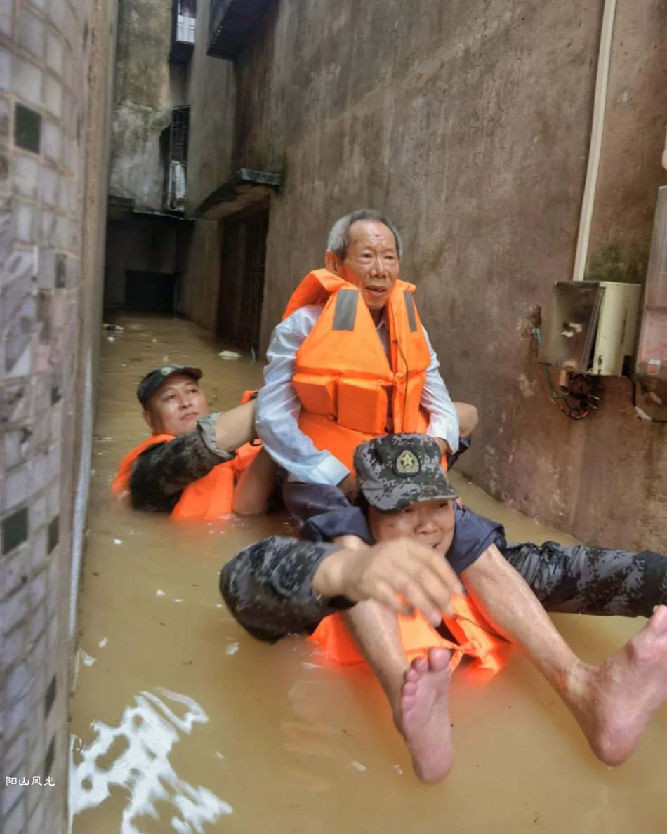 ▲2022年6月21日,连州市九陂镇派出15名民兵在连州市人武部的统一指挥下支援阳山抗洪抢险救灾,图为九陂镇民兵黄秋林(前)等人用“人体担架”将被困老人救出。摄影|杜建芬