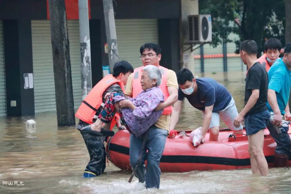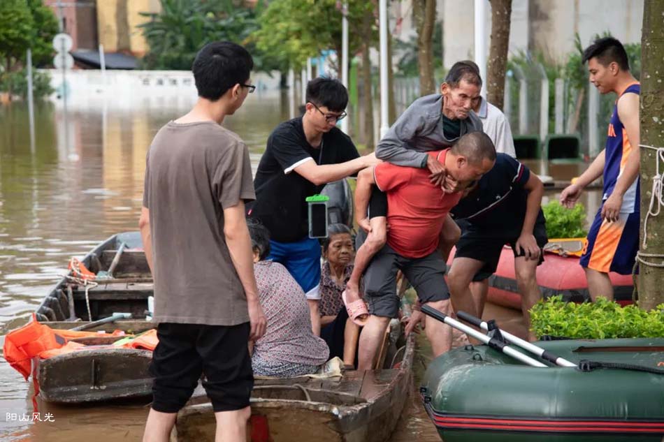 ▲2022年6月21日上午11时,阳山县小江镇政府救援队转移小江村谢屋村4名群众。摄影|小江镇政府