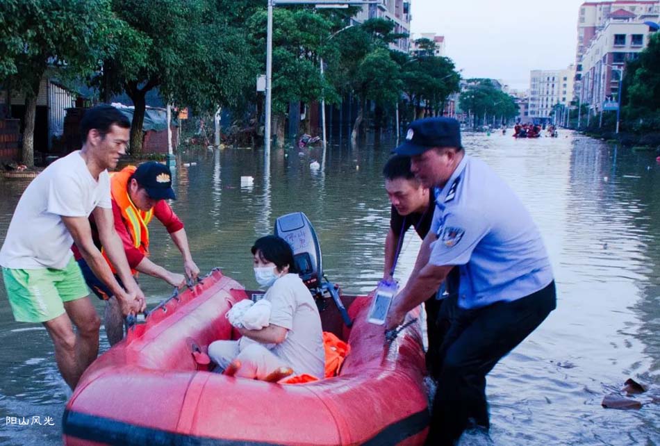 ▲2022年6月23日晚,英德市公安局巡警大队民辅警在浛洸镇救助受困群众。摄影|黄锦新