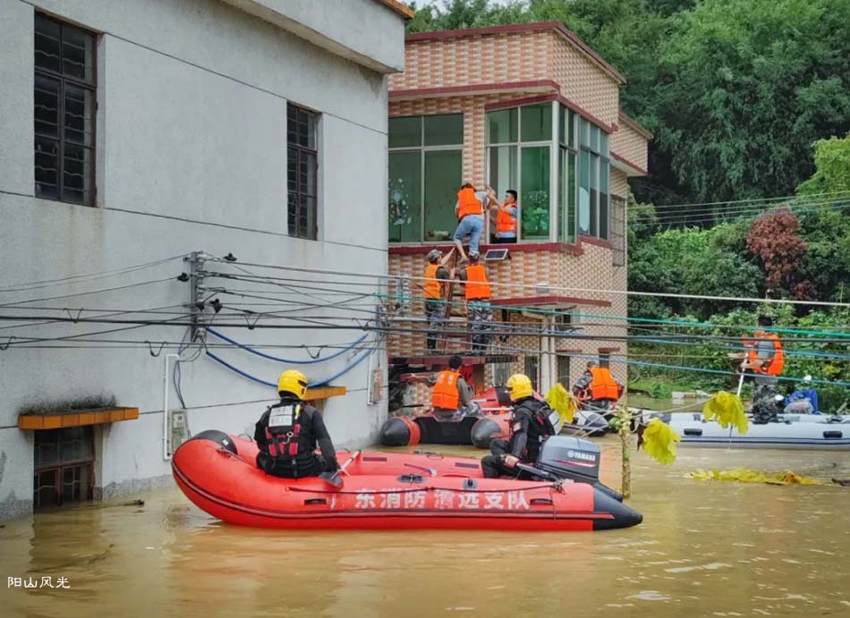 ▲2022年6月21日晚,佛冈消防员彻夜救援龙山镇下岳村受灾群众。摄影|佛冈县委
