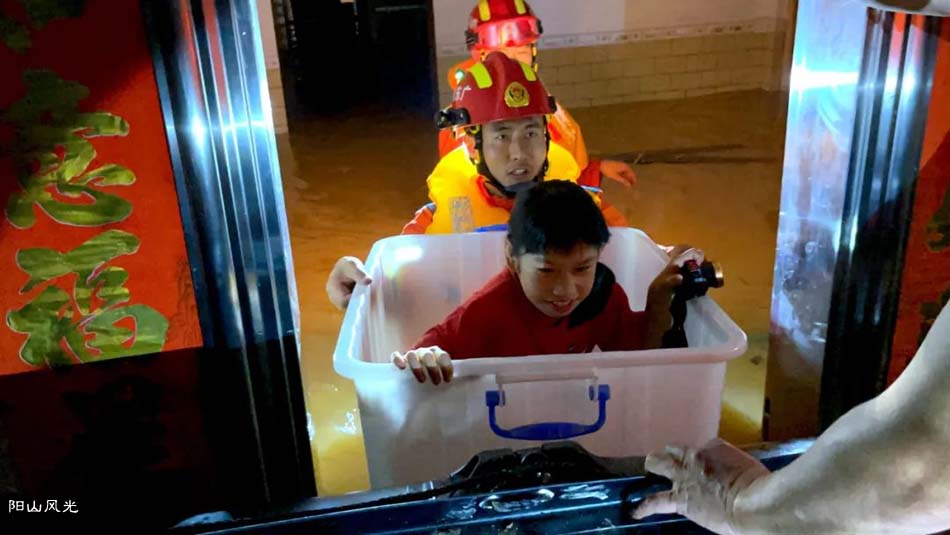 ▲2022年6月20日,清远消防支队队员在佛冈县龙山镇下岳村转移受灾群众。摄影|黄超贤