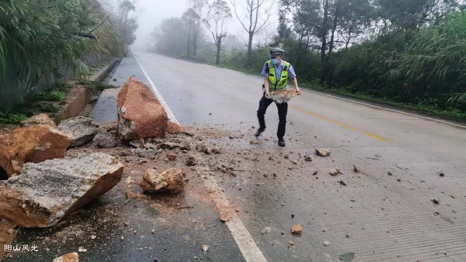 ▲2022年6月20日,国道G234线连山壮族瑶族自治县小三江镇月久村路段因连日暴雨引发山石滚落路面,连山公安局交警巡逻发现后迅速将石头搬离路面,及时消除隐患。摄影|黄超可